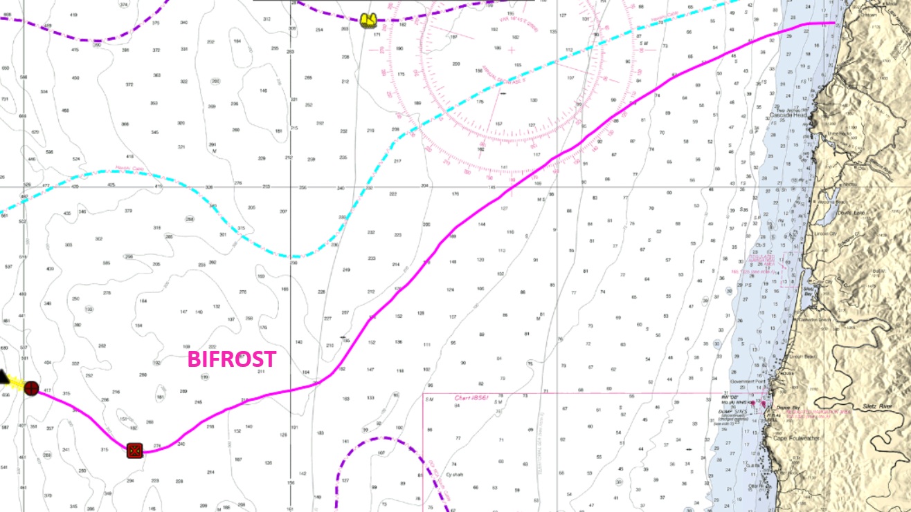 OFCC Version 12.1 is available for your plotters, adding the as-laid Bifrost Cable route. Bifrost lands a few miles North of Neskowin, between Cascade Hd and Cape Kiwanda.